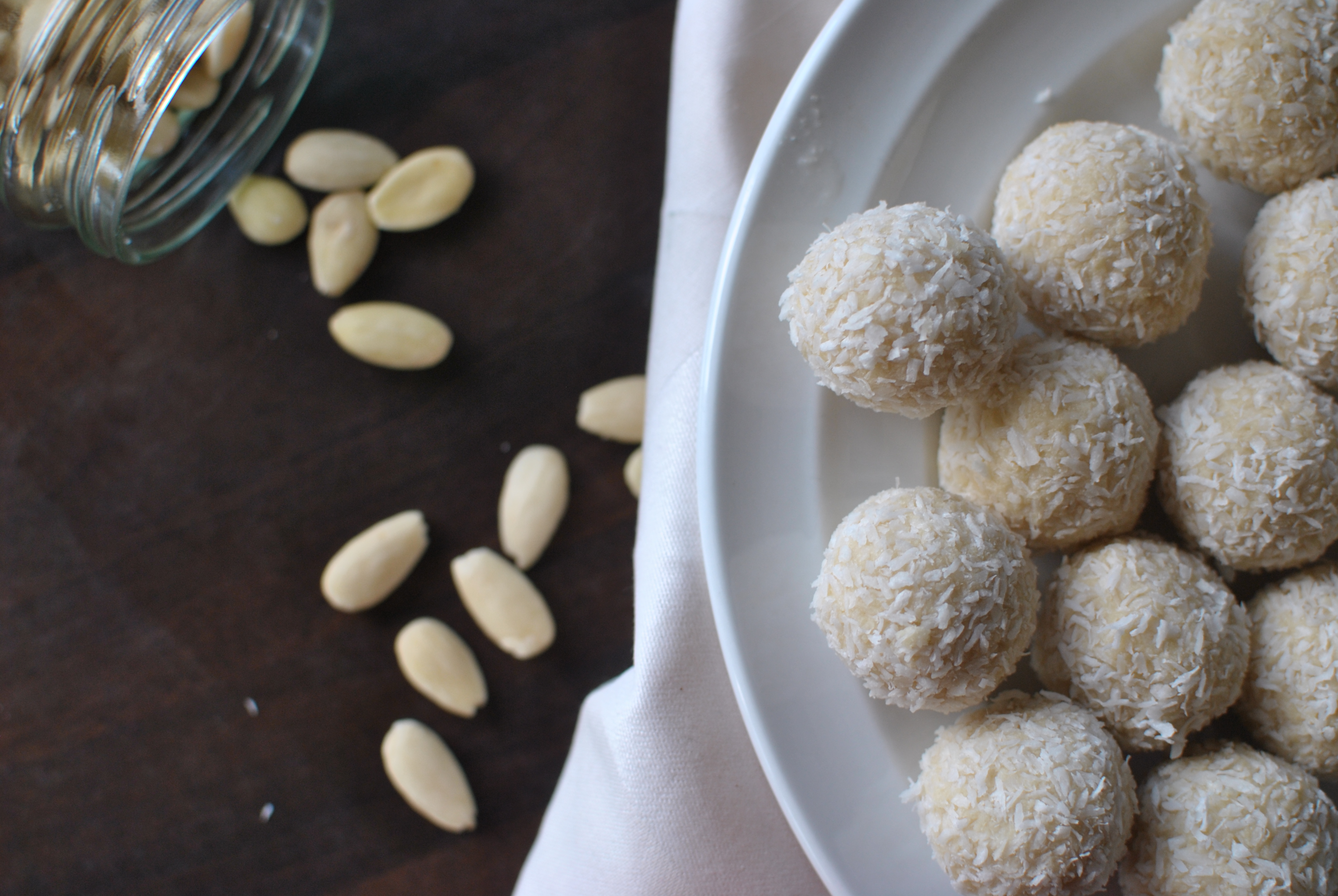 4. Roll into balls about a size of rafaello. Take almond and force it into the centre of a ball. Put the remaining desiccated coconut in a bowl and roll each ball until it’s thoroughly coated.